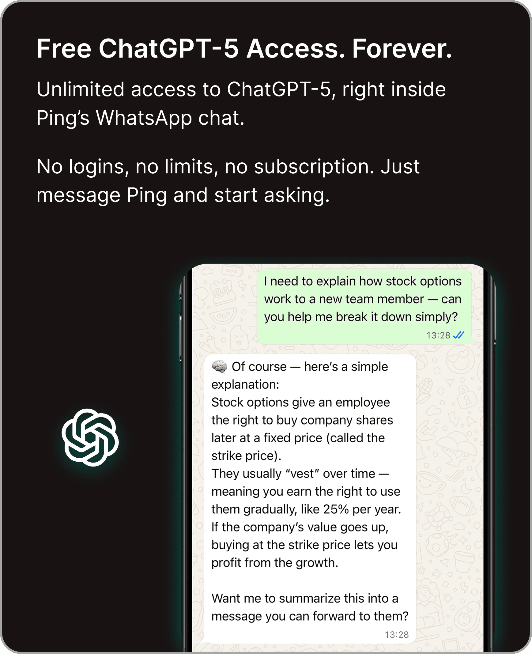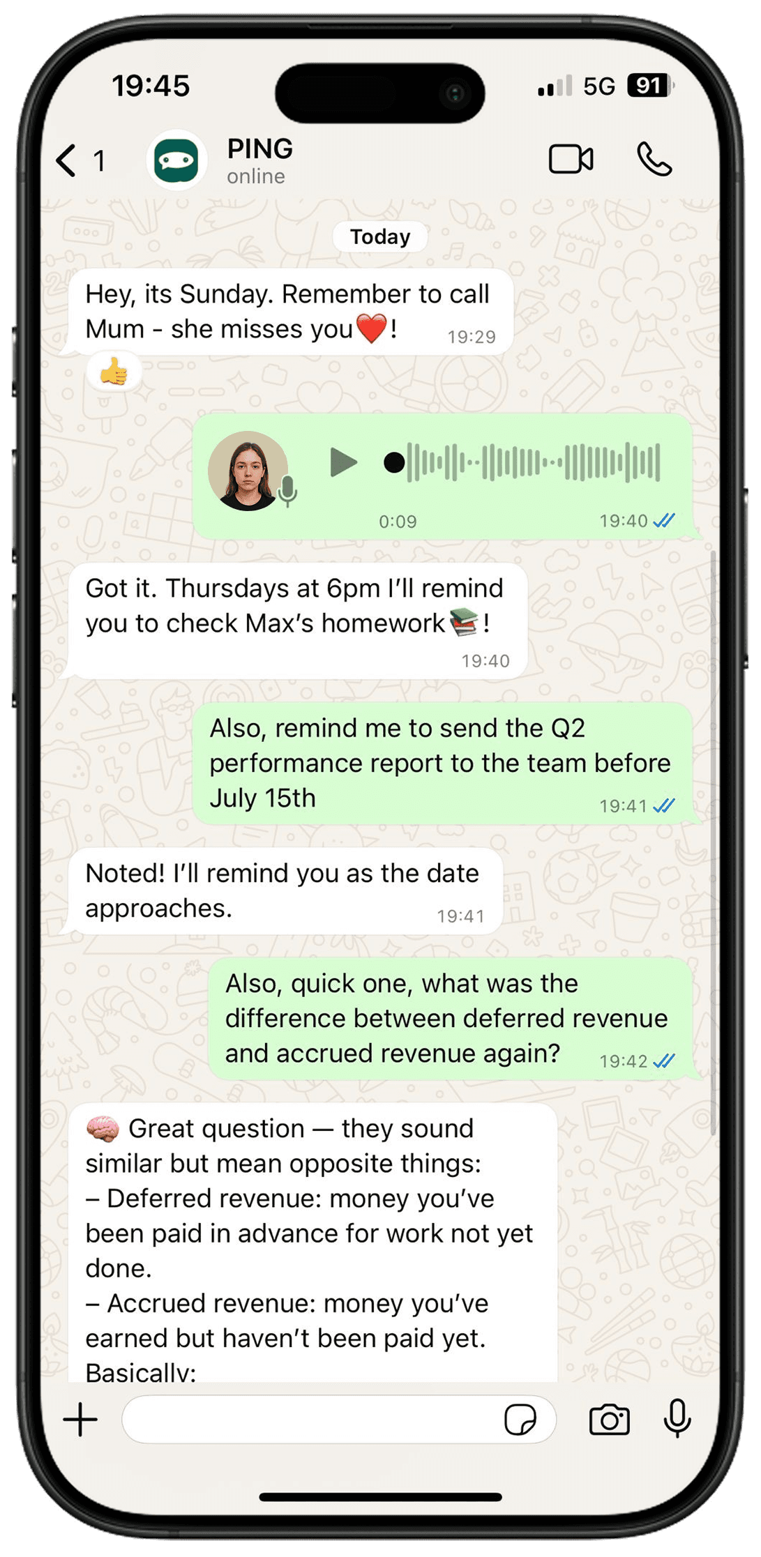 Ping has become part of my daily workflow. I use it to set reminders, take quick notes, and even access ChatGPT directly from WhatsApp.
